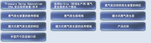 变压吸附装置利用各种化合物形态的吸附剂对气体吸附力的差异分离出气体混合物。气体分离工程中,压缩空气通过具有精密气孔的结晶体多微孔,要吸附的气体将借助吸附剂被吸附,要分离的气体将自由通过该层。变压吸附氮气发生器将除湿的压缩空气导入用炭分子筛(Carbon Molecular Sieve)作吸附剂充填的两个以上的吸附塔,然后反复经过加压->吸附->减压->清洁加工连续生产高纯度的氮气。